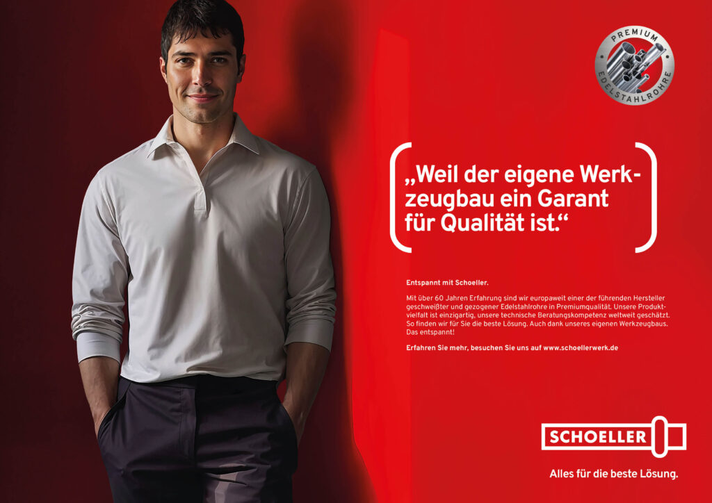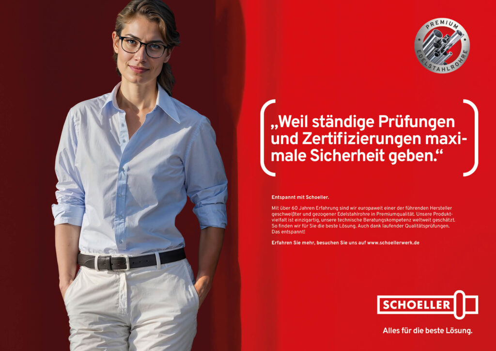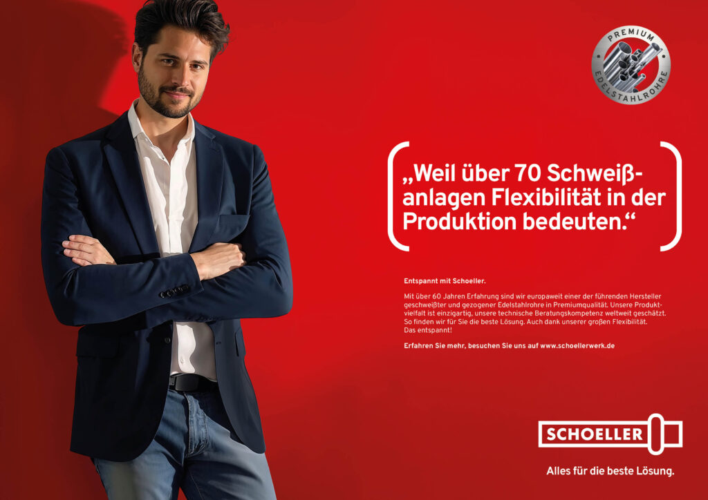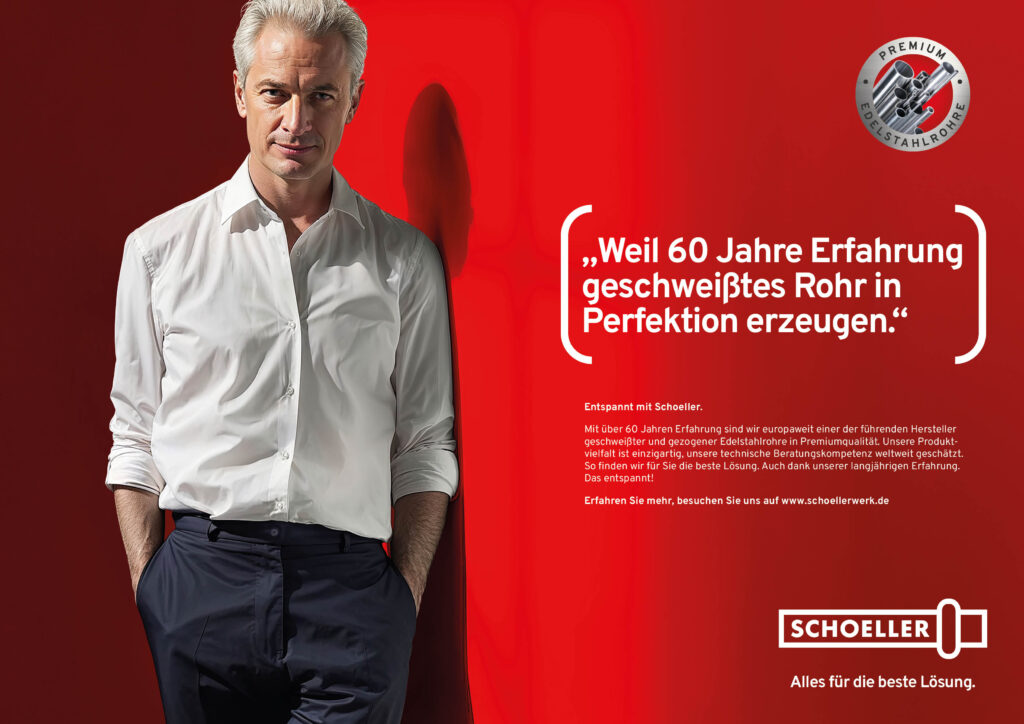 Vom 15. bis 19. April öffnet die Weltleitmesse der Rohrindustrie in der Messe Düsseldorf wieder ihre Pforten. Für unseren Kunden Schoeller, einen der europaweit bedeutendsten Hersteller von Edelstahlrohren, haben wir für diese wichtige Branchenplattform einen auffälligen und besonderen Auftritt entwickelt, der sich sowohl in der Gestaltung des Messestandes als auch in der begleitenden Fachkommunikation zeigt. Die Leitaussage des Auftritts lautet „Entspannt mit Schoeller“, also das zentrale, emotionale Leistungsversprechen der Marke. Gezeigt werden sechs fiktive Kunden in entspannter, zufriedener Haltung, die jeweils einen relevanten Reason Why in einer Zitat-Headline“ präsentieren.